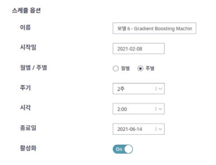 다행히도 다빈치랩스에서는 모델 업데이트 기능을 통해 주기적으로 성능을 유지할 수 있는 기능을 보유하고 있습니다. 아래 이미지와 같이 업데이트 주기, 시각 등을 설정하면 데이터의 성능이 저하될 우려가 있는 시점에 알람을 받을 수 있고, 유저가 적절히 기존 모델에 신규 데이터를 추가 학습시킬 수 있죠.
