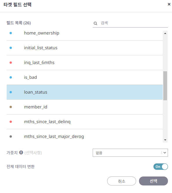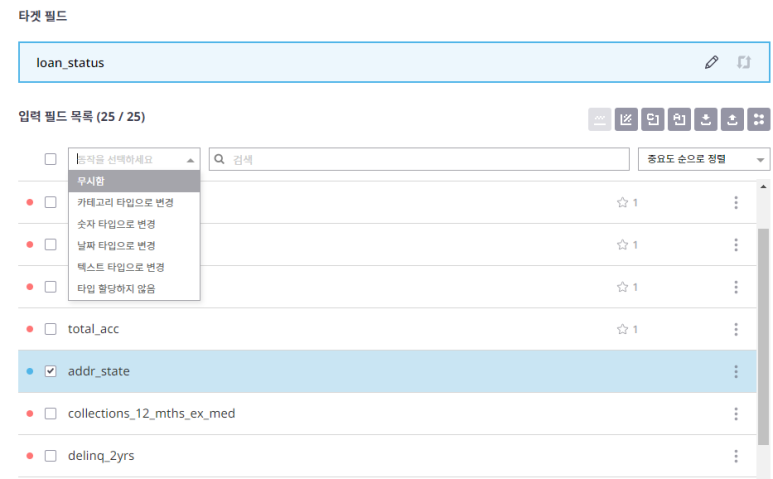 파일이 잘 올라갔으면 이제 공식의 종속변수가 무엇인지 설정해줘야합니다. 우리가 예측하고자 하는 내용은 '과연 고객이 대출금을 성실하게 갚을 것인지, 고스란히 꿀꺽 삼킬 것인지'이기 때문에 위에서와 같이 loan_status를 타겟 필드(종속변수)로 선택합니다.