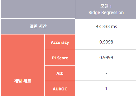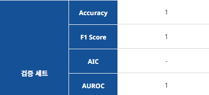 Accuracy (정확도)가 개발 세트는 0.9998, 검증 세트는 1 (이건 통계학적으로 사기입니다...과적합 중에서도 탑급)